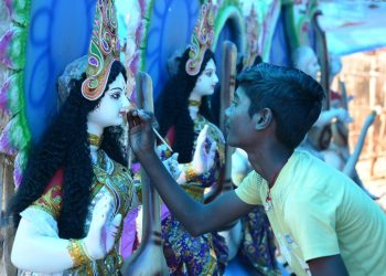 An artist gives final touches to clay idols of Goddess Saraswati Two girl students check out clay idols of...