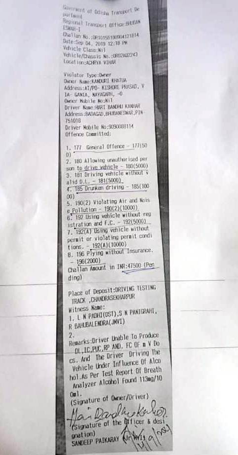 The Bhubaneswar regional transport office issued the challan against the former owner of the vehicle Kanduri Khatua – a resident of Gania in Nayagarh district as the documents related to ownership transfer have not yet been processed.