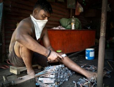 A worker shapes hardware items at a foundry in Ranihaat area in Cuttack, Wednesday, after the authorities relaxed lockdown norms.