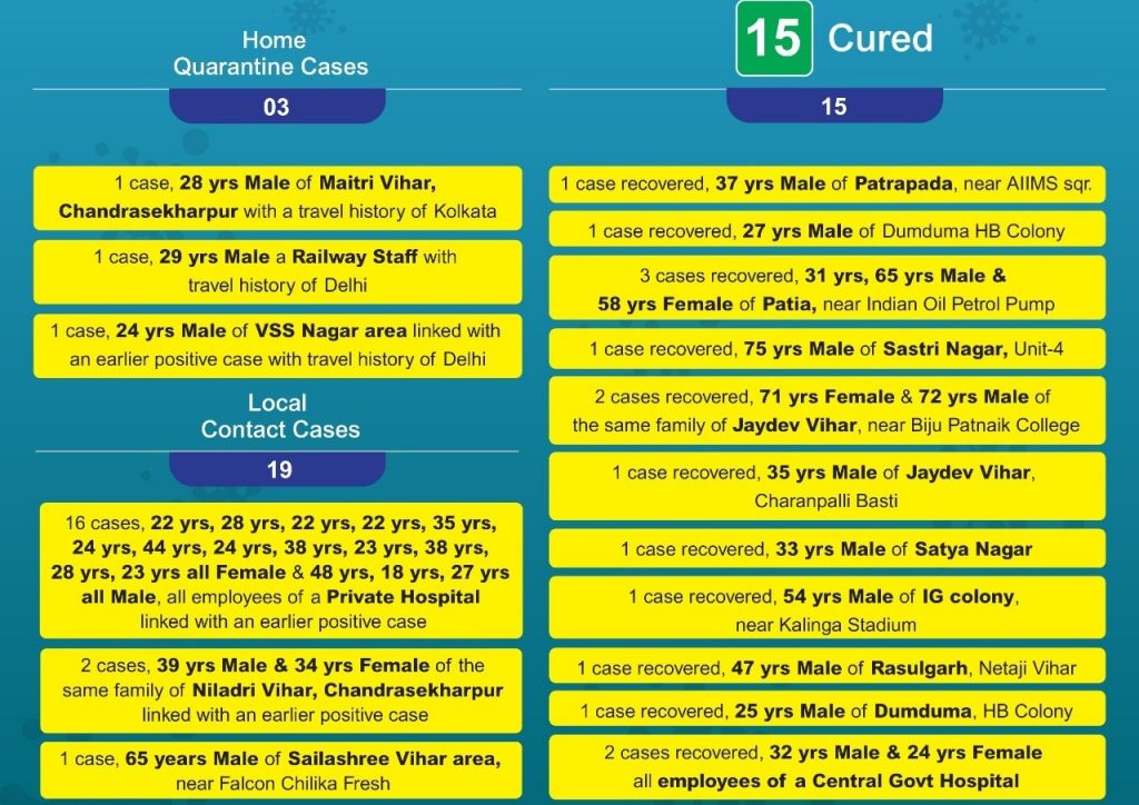 While three of them are home quarantine cases, as many as 19 cases are local contact ones. Of the three home quarantine cases, one was a 28-year-old male from Maitree Vihar area with travel history to Kolkata, the second one is a 29-year-old male railway staff with travel history to Delhi and the third is a 24-year-old male from VSS Nagar area with travel history to Delhi.