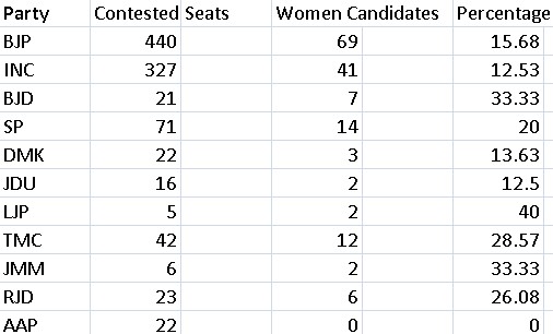 The Samajwadi Party (SP) fielded 14 women candidates out of 71 total candidates, which is about 20 per cent. The DMK fielded 22 candidates, of which 3 were women (13.63 per cent).