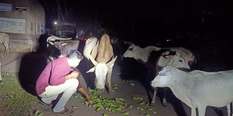 Amid lockdown, a youth feeds hungry stray cattle in Angul town