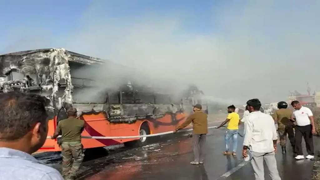 According to police, the bus, carrying 57 passengers, left Jaisalmer around 3 pm. On the Jaisalmer-Jodhpur highway, smoke began emerging from the rear portion. The driver stopped the bus along the roadside, but within moments, the flames engulfed the vehicle.
