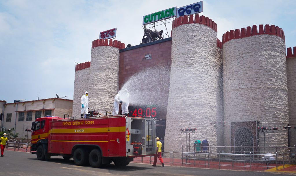 Odisha Fire Services personnel sanitise Cuttack railway station, Thursday