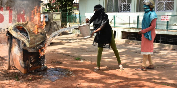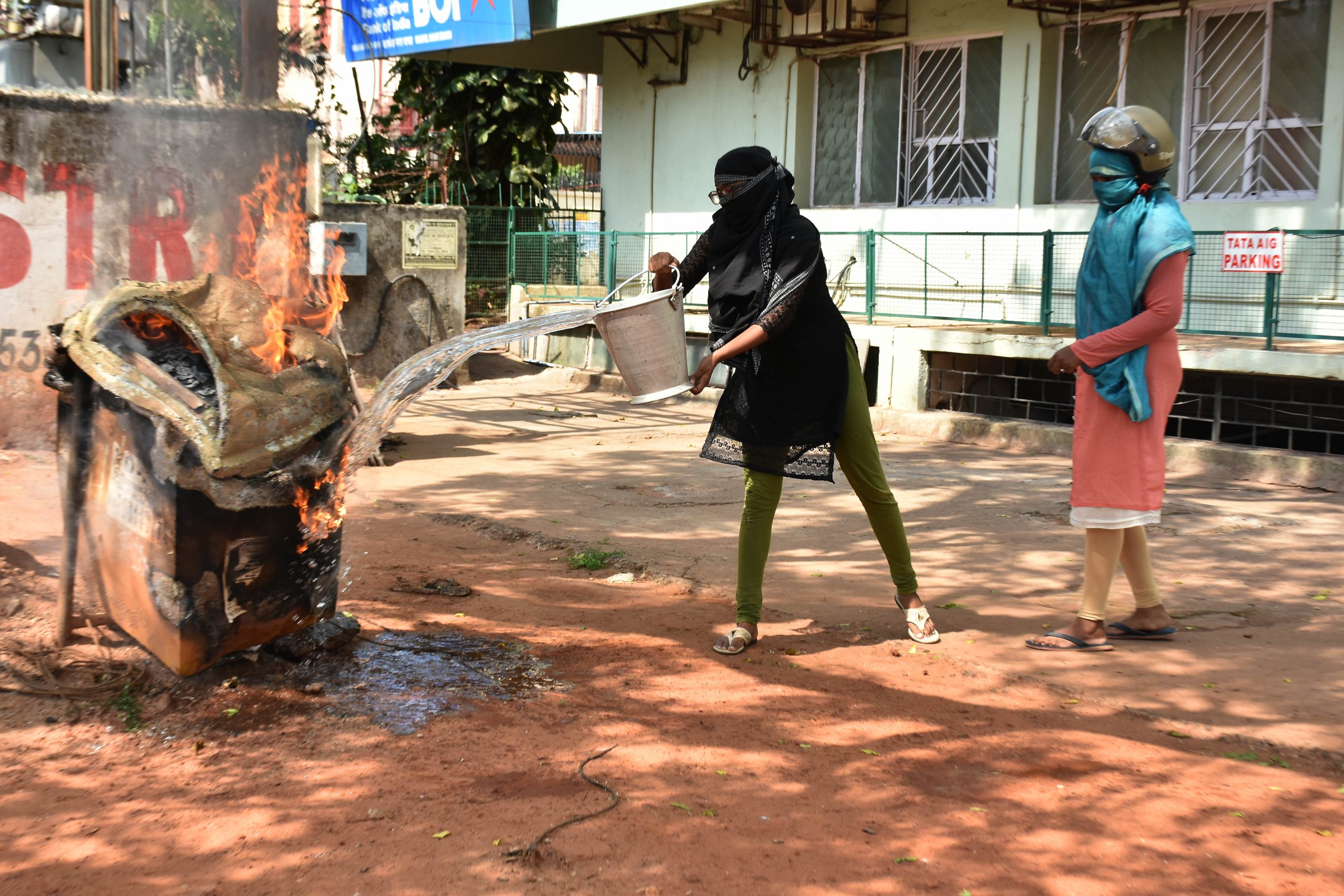 A girl douses flames caught by a trashcan near Keshari hall in Bhubaneswar, Friday