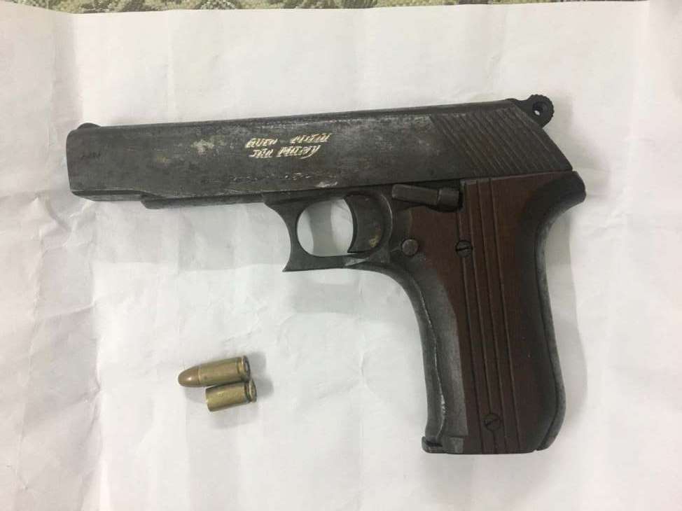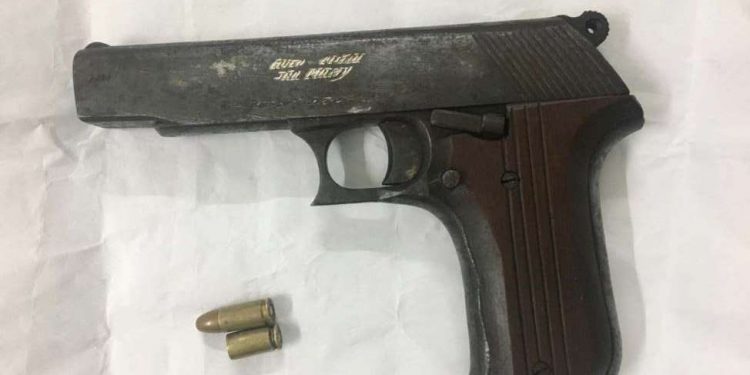 A 9 mm pistol, an empty cartridge and a live bullet were seized from his possession.