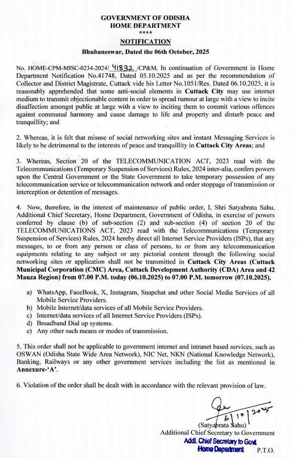 It is apprehended that some anti-social elements in Cuttack City may use the internet to transmit objectionable content to spread rumours with a view to inciting the people to commit offences against communal harmony and cause damage to life and property and disturb peace and tranquility, the notification said.