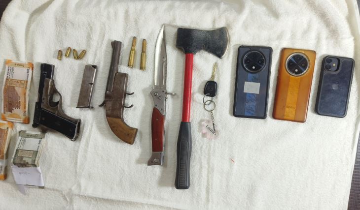 While the occupants attempted to flee after spotting the police, they were apprehended by the cops. During a search conducted in the presence of witnesses, police recovered two country-made pistols, six live rounds and a magazine from the accused. A knife was seized from Panda, while a small axe, a live bomb and cash amounting to Rs 39,300 were recovered from the car.