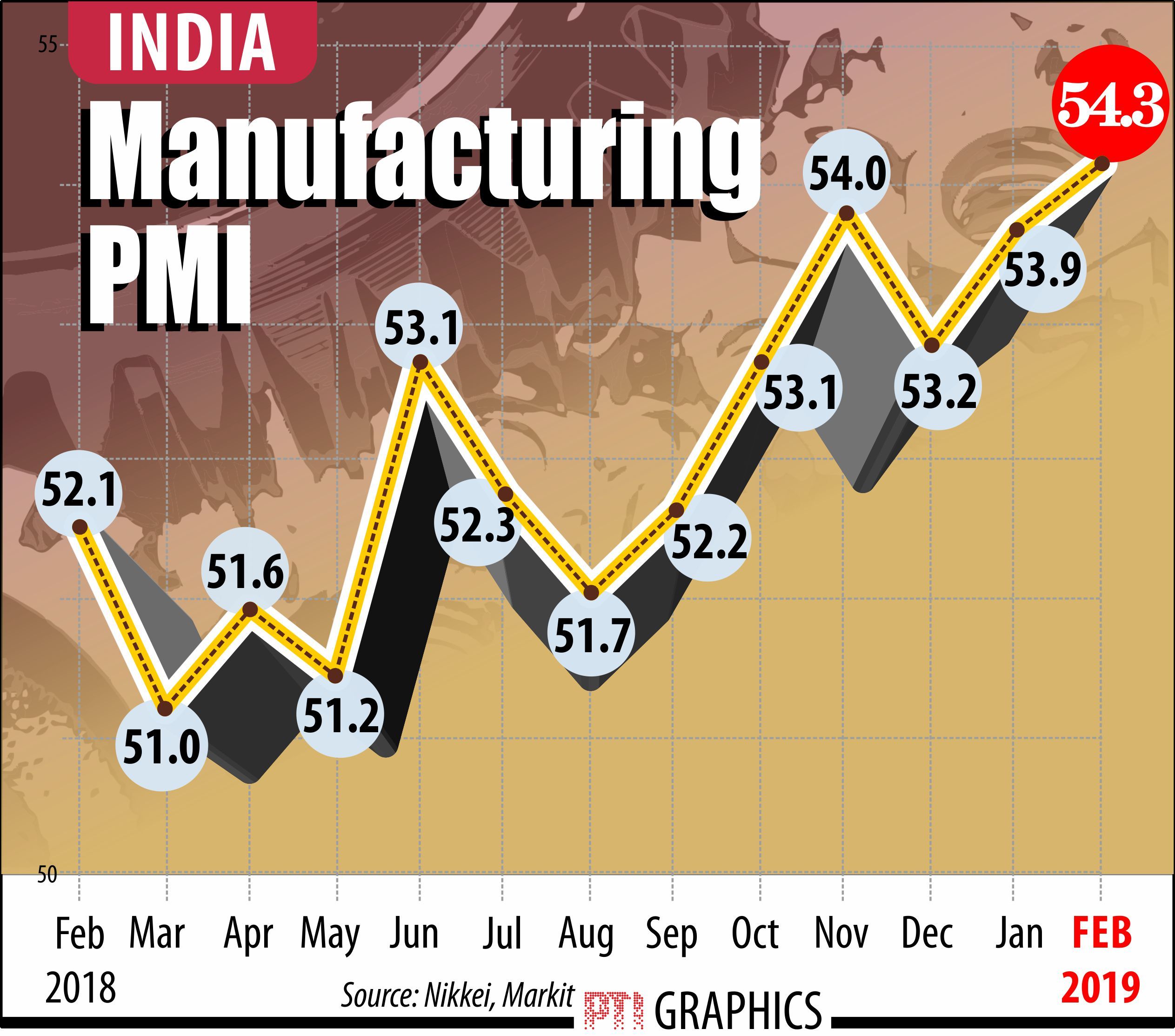 The Nikkei Manufacturing Purchasing Managers’ Index, compiled by IHS Markit, increased to a 14-month high of 54.3 in February from January’s 53.9, confounding a Reuters poll predicting a dip to 53.5.