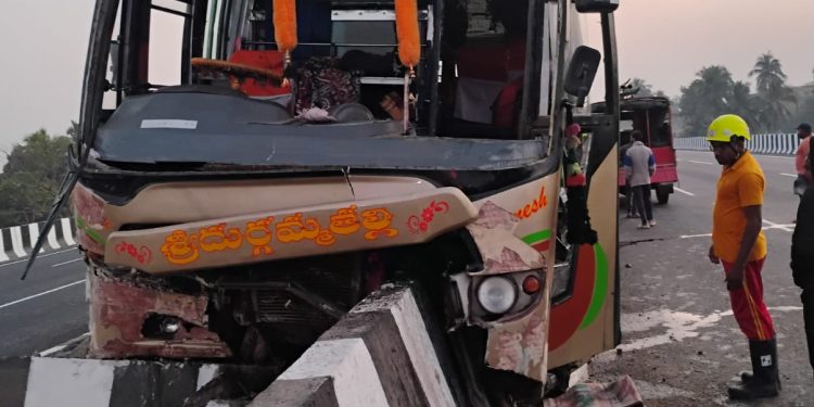 Balasore: The driver of an Andhra Pradesh-bound bus carrying pilgrims from West Bengal died, and ten passengers suffered injuries when the vehicle rammed into the wall of an overbridge on National Highway 16 in Balasore district Friday, police said.