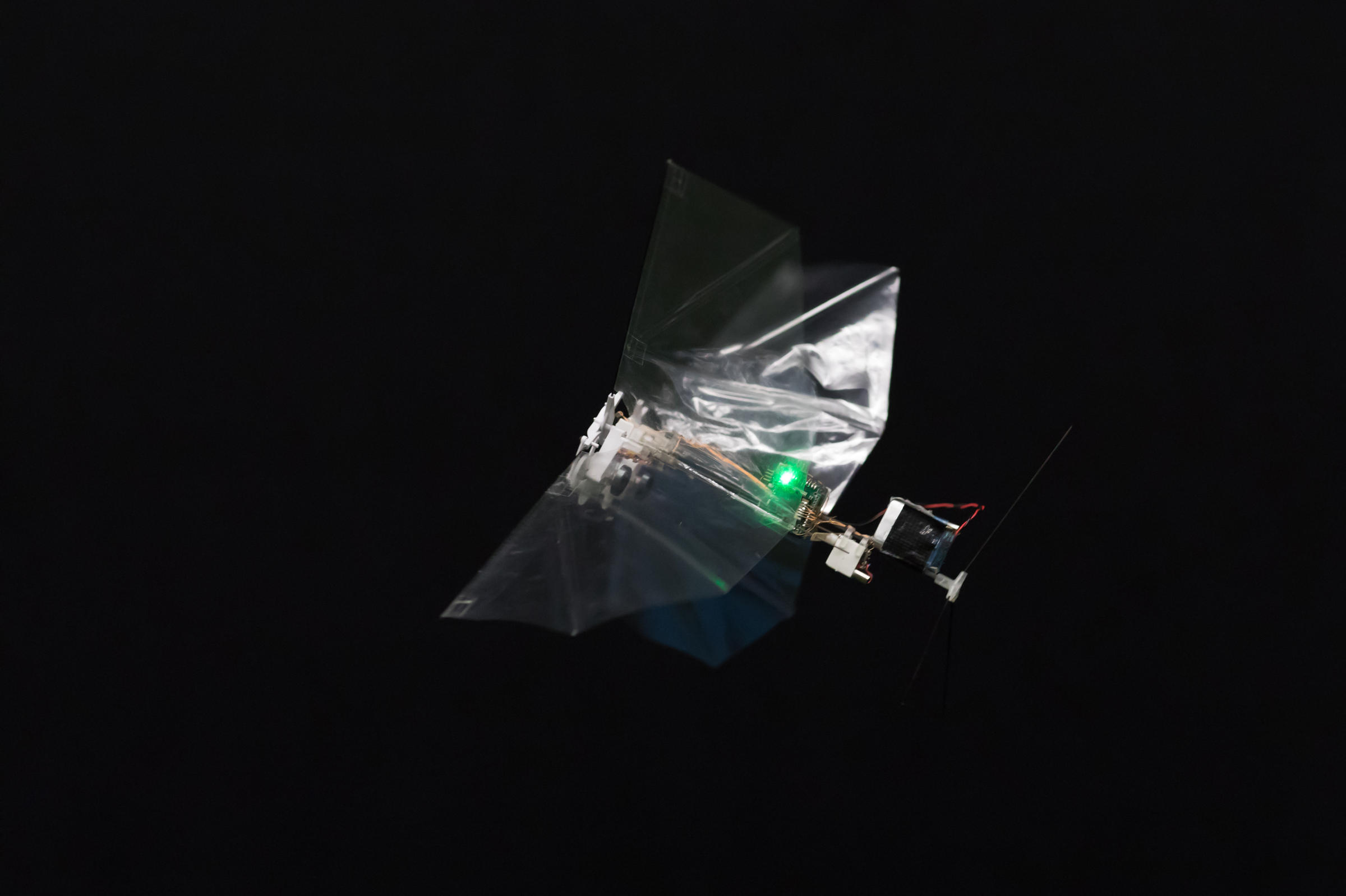 As in flying insects, the robot’s flapping wings, beating 17 times per second, not only generated the lift force needed to stay airborne but also control the flight via minor adjustments in the wing motion.