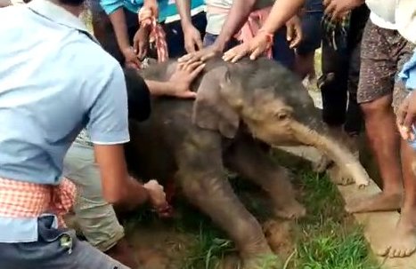 After spotting the elephant calf Thursday morning, the locals rescued and brought it to their village carrying it on their shoulders.