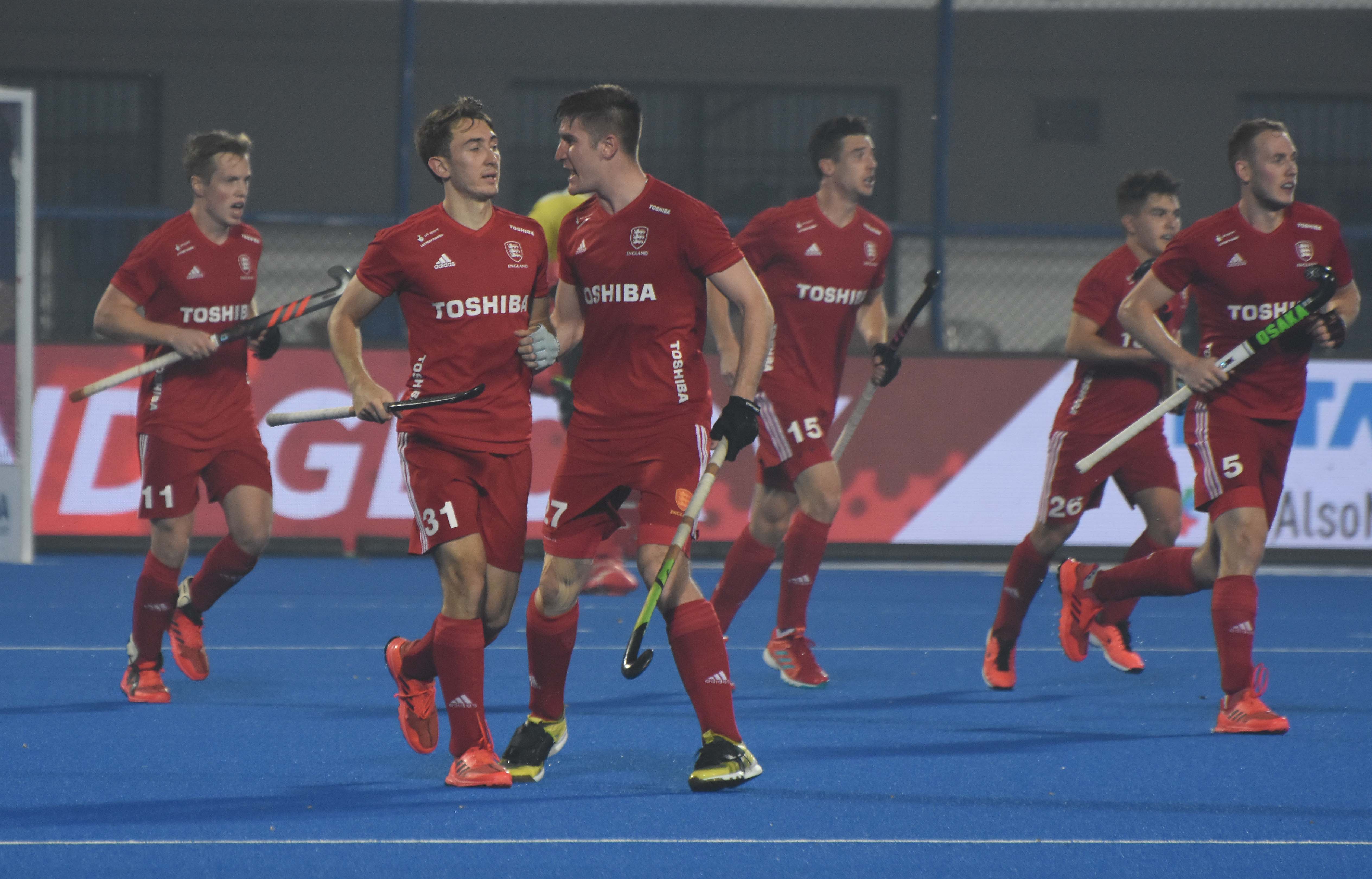 England players celebrate after scoring against Ireland at Kalinga Stadium, Friday