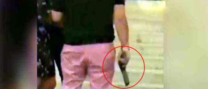 In the video, the accused is brandishing a weapon and his friends can be heard abusing a man, who accidentally used the ladies’ washroom.