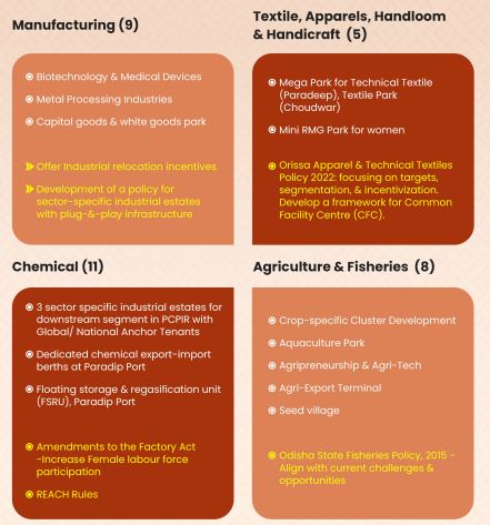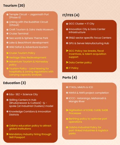 The Odisha Chief Minister has pointed out that plans have been made for more than 80 projects in sectors such as metal downstream industries, biotechnology, textiles, chemicals, tourism, education and IT. Besides, over 30 policy initiatives will be undertaken, he added.