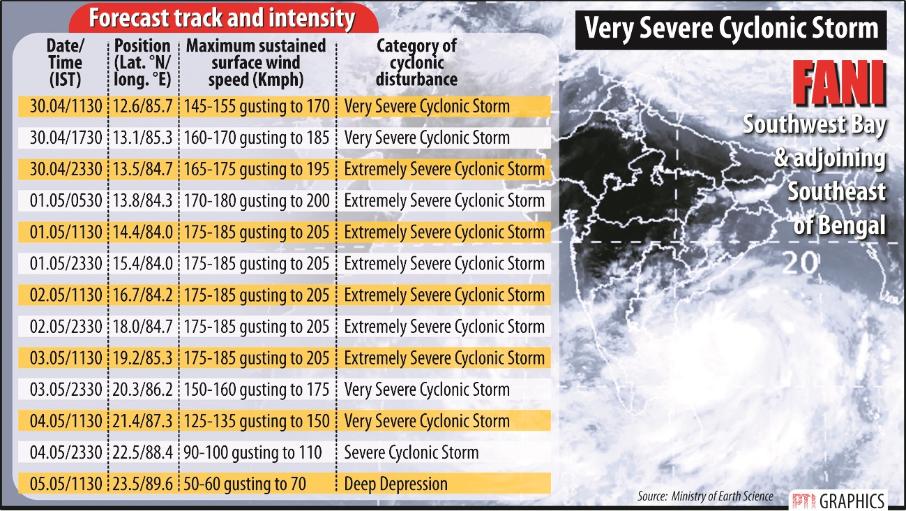 The system will intensify into an extremely severe cyclonic storm during next six hours and then, it will move northwestwards till May 1. Thereafter, it will recurve north-northeastwards and cross Odisha coast between Gopalpur and Chandbali, to the south of Puri around May 3 afternoon with maximum wind speed of 175-185 kmph gusting up to 205 kmph, the Met said.