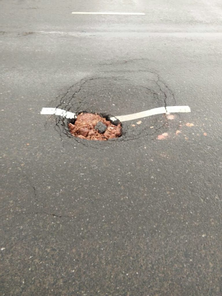 The formation of over 4-5 ft deep crater is indicative of faulty construction work on the highway. Fearing accidents, villagers have filled the crater with murram.