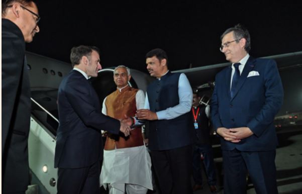 Mumbai: French President Emmanuel Macron arrived in Mumbai Tuesday, ahead of his meeting with Prime Minister Narendra Modi, where the two leaders will review the progress made in the India-France strategic partnership. Maharashtra Governor Acharya Devvrat and Chief Minister Devendra Fadnavis were present at the Mumbai airport to receive the French leader.