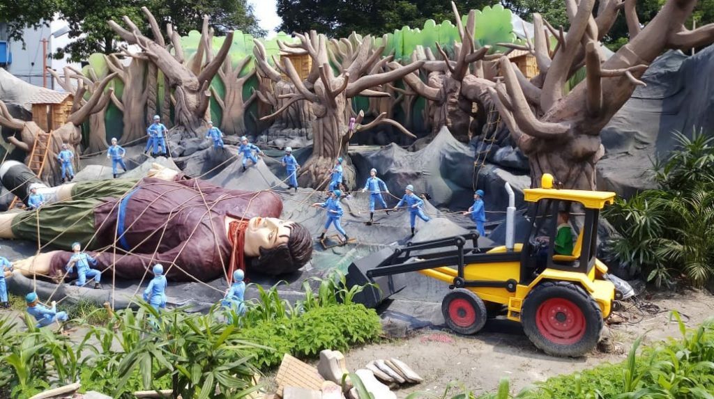 At the FD Block Puja in Salt Lake, scenes from ‘Gulliver’s Travels’, a novel by Jonathan Swift, have been recreated with a giant model of Gulliver lying on the ground and surrounded by dwarf-sized installations.