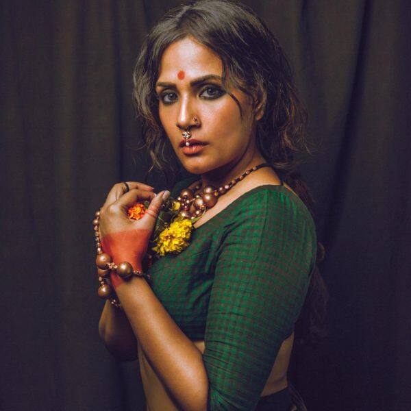 With dark kohl-rimmed eyes and a red bindi on her forehead, teaming up her look in a silk cotton sari, Richa cuts an intriguing picture. She is also seen wearing rustic jewellery.