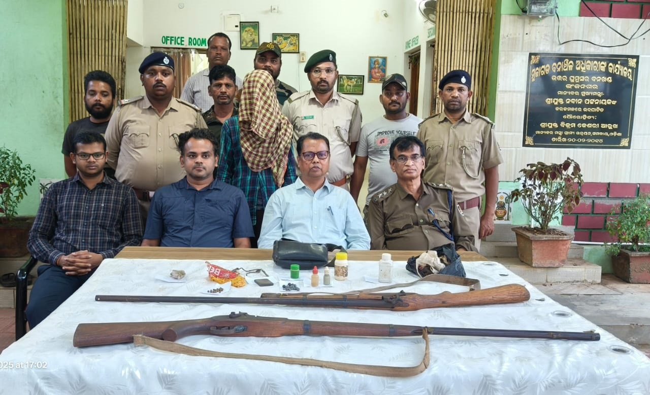 Addressing a presser Monday evening, Divisional Forest Officer (DFO) Himansu Sekhar Mohanty said officials seized two functional guns, one broken gun, bullets, explosives, and other materials from Pradhan’s possession.