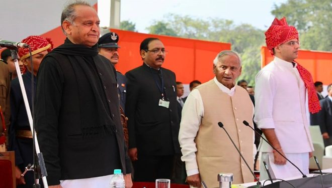 Jaipur: Congress leader Ashok Gehlot was sworn in Monday as the 12th Chief Minister of Rajasthan, while the party’s state president Sachin Pilot took oath as his deputy at a ceremony here.