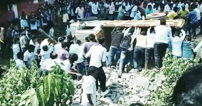 Kaptipada: A college girl got trapped under a brick-laden truck that overturned near Kaptipada College in Mayurbhanj district Thursday.