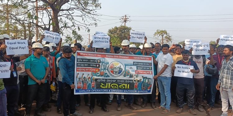 Chhatrapur: Hundreds of workers at Gopalpur Port in Ganjam district staged a protest in front of the port gate Tuesday, demanding equal pay for equal work and compliance with labour laws. Under the banner of ‘Ganjam Operators and Drivers Mazdoor Sangha’, the protesting workers alleged that despite working for years under authorised vendors and contractors appointed by the Adani Group—which is responsible for the port’s development—they have been denied their rightful benefits.