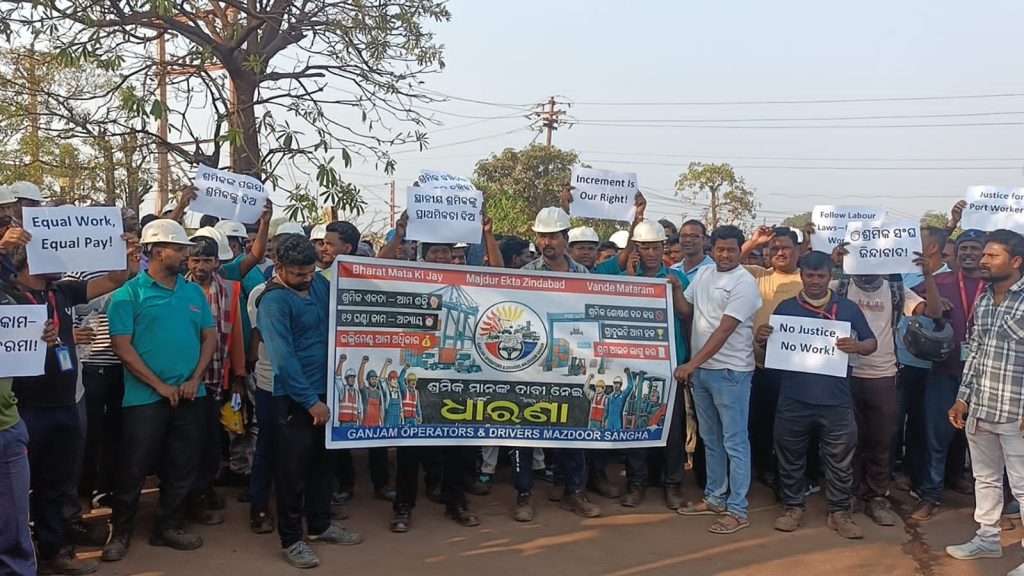 Chhatrapur: Hundreds of workers at Gopalpur Port in Ganjam district staged a protest in front of the port gate Tuesday, demanding equal pay for equal work and compliance with labour laws. Under the banner of ‘Ganjam Operators and Drivers Mazdoor Sangha’, the protesting workers alleged that despite working for years under authorised vendors and contractors appointed by the Adani Group—which is responsible for the port’s development—they have been denied their rightful benefits.
