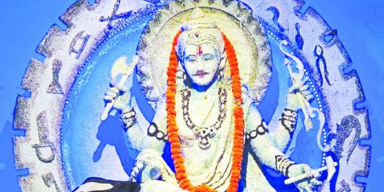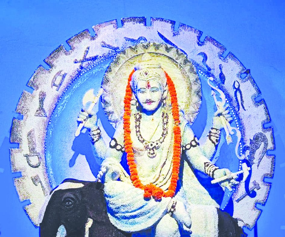 Bhubaneswar: In a unique display of craftsmanship, students of Dhauli College of Art and Crafts near the Peace Pagoda have created an eco-friendly idol of Lord Vishwakarma using sago and mustard. The 9-foot-tall idol made using 10kg sago and 3kg mustard took 15 days for as many students of the college to complete it. They used clay, sago and mustard, emphasising the eco-conscious approach of the institution.
