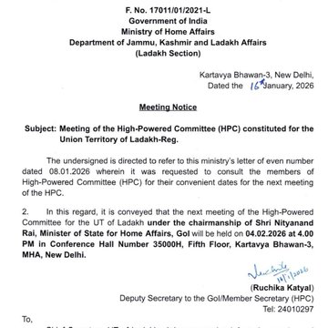 …it is conveyed that the next meeting of the High Powered Committee for the UT of Ladakh under the Chairmanship of Shri Nityanand Rai, Minister of State for Home Affairs, GoI, will be held on 04.02.2026 at 4.00 PM…, a notice issued by Deputy Secretary Ruchika Katyal Friday said.