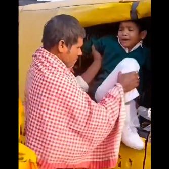 Bystanders appear astonished by the scene. Some are seen laughing, while others record the family drama on their mobile phones. The school van briefly turns into a battleground, with a determined father on one side and a child dreaming of a holiday on the other. Eventually, the son has his way — as the child prepares to leave for school, the father also joins him inside the school van.