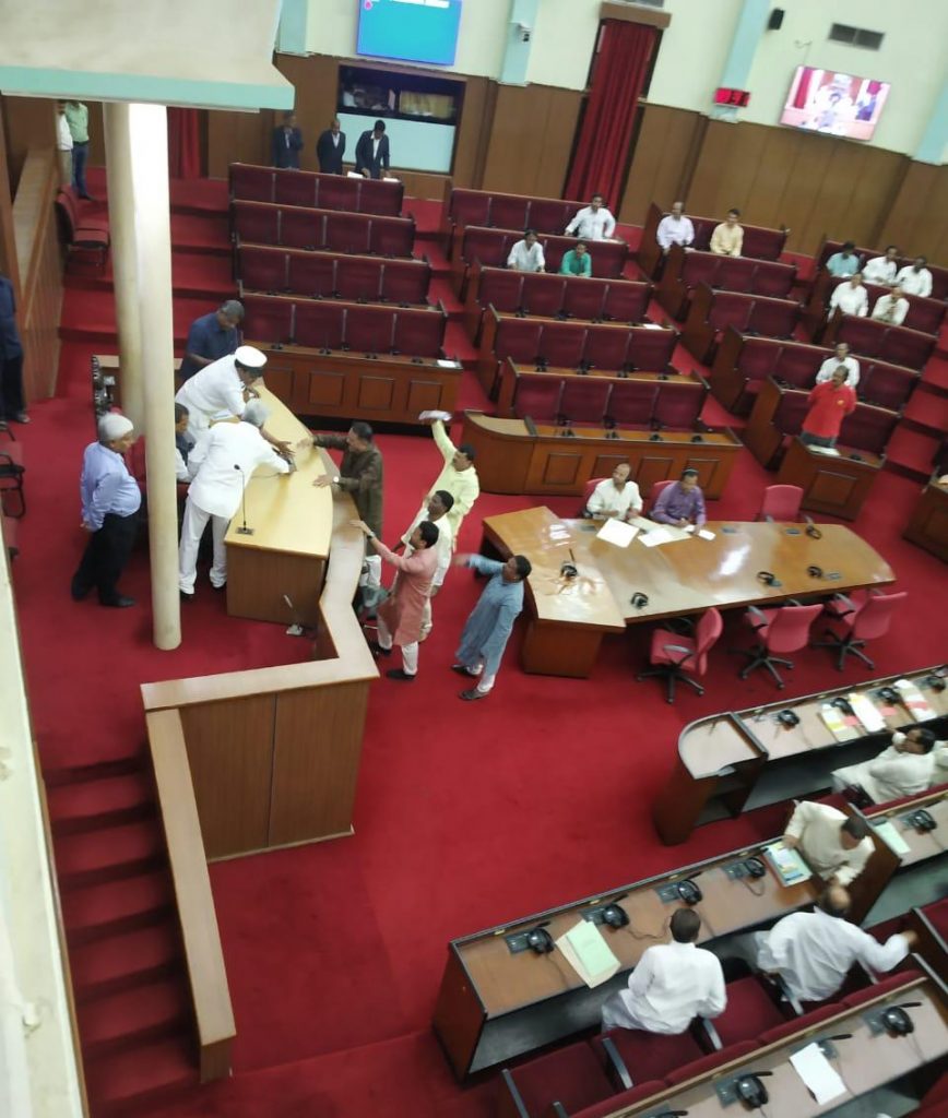 Soon after the House assembled at 10.30 am and the Speaker Pradip Amat started the proceedings, Congress party members led by their Chief Whip Taraprasad Bahinipati rushed to podium of Speaker and raised slogans against fuel price hike. They demanded adjournment of the House. BJP members also protested against the alleged Omfed and cooperative bank scams in the state.