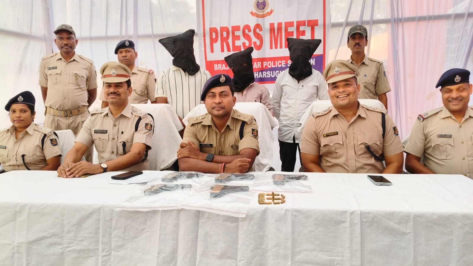 Police first detained Vishal Bag and recovered two country-made guns from him. Based on his interrogation, Santosh Khedkar was arrested and two more firearms were seized. Later, Banti Prasad was arrested, and one more country-made pistol was recovered from his possession. A case (95/26) has been registered at Brajarajnagar police station.