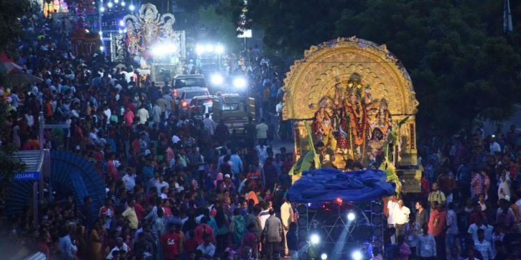 Bhubaneswar:The immersion ceremony of Goddess Durga, locally known as ‘Bhasani Utsav’, began Wednesday after Vijayadashami came to an end Tuesday marking the conclusion of Dussehra festivities. Organisers of all major puja pandals along with the police left no stones unturned to ensure a smooth immersion ceremony. Residents of Bhubaneswar and Cuttack were quite excited to participate in the grand occasion where they got one last glimpse of the clay idols before immersion. Commissionerate police had announced elaborate route plans to avoid traffic congestion. Bhubaneswar Municipal Corporation (BMC) created temporary artificial ponds on the banks of Daya and Kuakhai rivers for immersion.