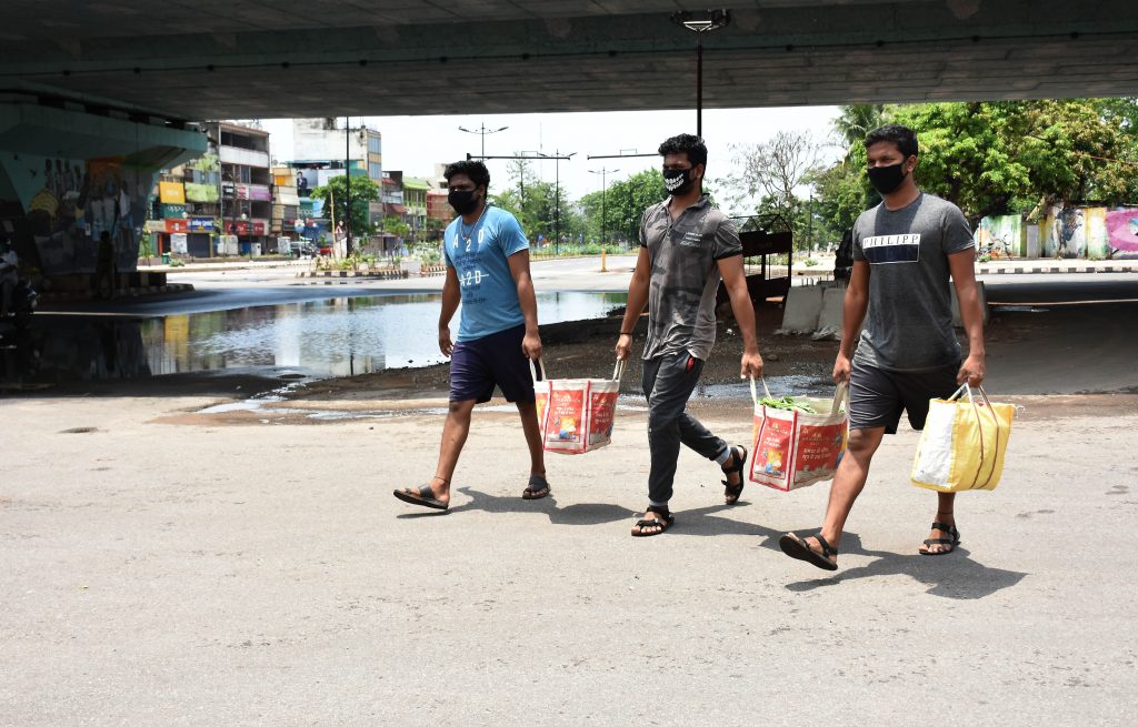 Youths walking back home with vegetables near Master Canteen in Bhubaneswar, Saturday