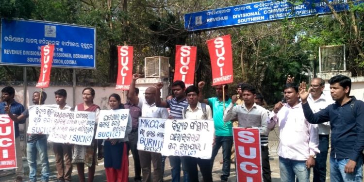 SUCI activists staging a demonstration outside the RDC office in Berhampur Monday, demanding withdrawal of privatisation of discoms; Rs 10 lakh compensation to the deceased persons and Rs 5 lakh for the injured following the death of 10 bus passengers in Ganjam bus-mishap