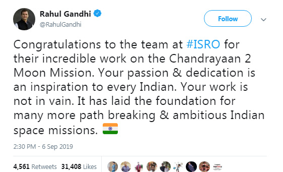While congratulating ISRO, Congress leader Rahul Gandhi said their work was not in vain. “It (Chandrayaan-2) has laid the foundation for many more path breaking and ambitious Indian space missions,” Rahul tweeted.