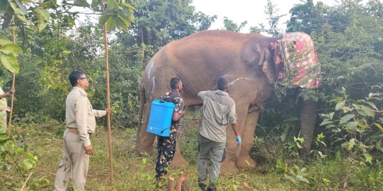 Keonjhar: A makhna (tuskless male) elephant, apparently injured in a fight with other elephants, was treated by a veterinary team Tuesday in the Telkoi forest range area of the Keonjhar forest division, officials said. According to Forest Department sources, a 10-member team was formed to handle the rescue and treatment operation. The team included Sudipta Kumar Panda, Assistant Conservator of Forests, Keonjhar; veterinary assistant surgeons Dr Abhilash Acharya, Dr Brajraj Yadav, Dr Juel, and Dr Abhisek Nayak; along with biologists and other forest staff.