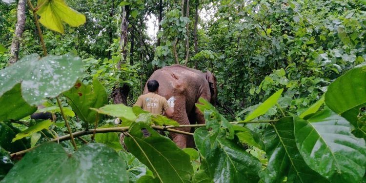 Champua: A team of 35 forest officials treated an injured elephant, which had been roaming in Champua forest range of Keonjhar district, after a long search for it.