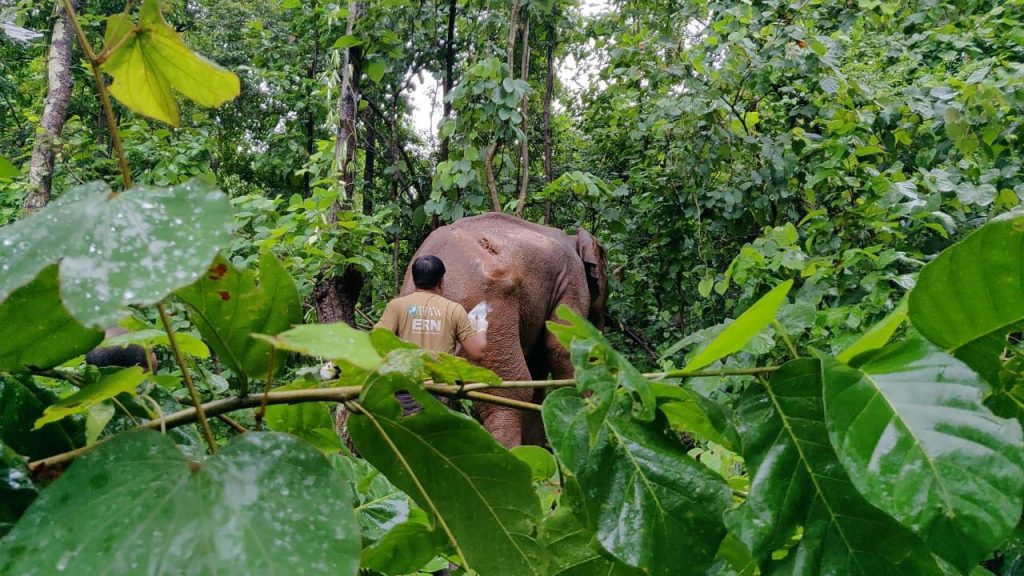 Champua: A team of 35 forest officials treated an injured elephant, which had been roaming in Champua forest range of Keonjhar district, after a long search for it.
