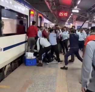 A shocking video has surfaced from Delhi’s Nizamuddin Railway Station, showing IRCTC employees violently fighting among themselves. The altercation reportedly involved staff associated with the Vande Bharat train.