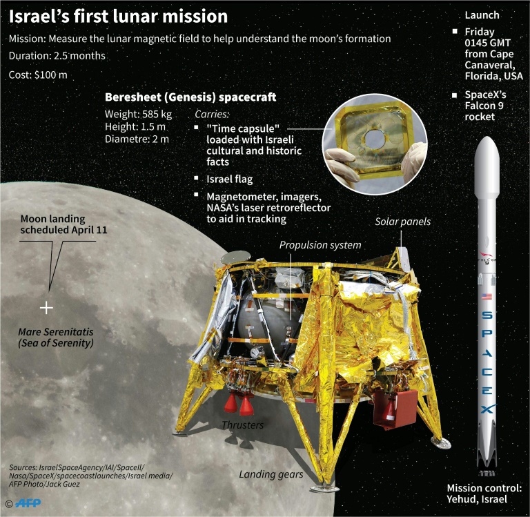 The 585-kilogram (1,290-pound) Beresheet, which means “Genesis” in Hebrew, lifted off at 8:45 pm (0145 GMT Friday) atop a Falcon 9 rocket from the private US-based SpaceX company of entrepreneur Elon Musk.