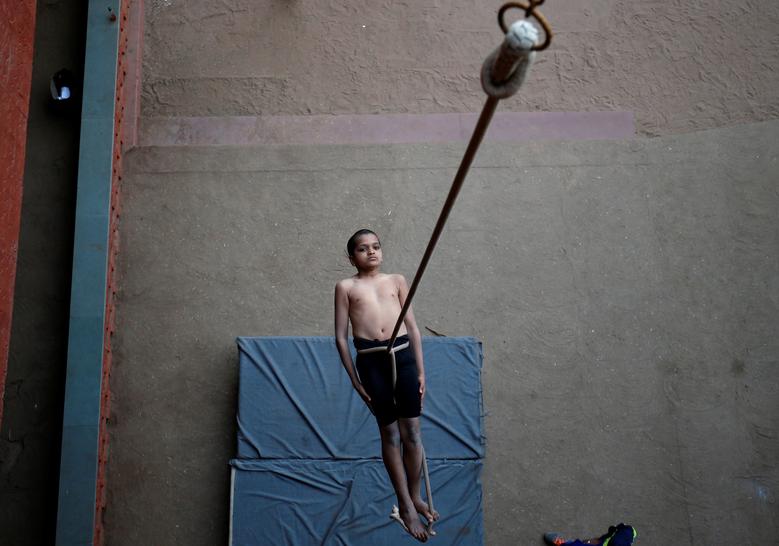 A participant practices "Mallakhamb" (traditional Indian gymnastics) while suspended from a rope during a practice session for the upcoming competition to promote the sport, in Ahmedabad, India, January 28, 2019. (REUTERS/Amit Dave)