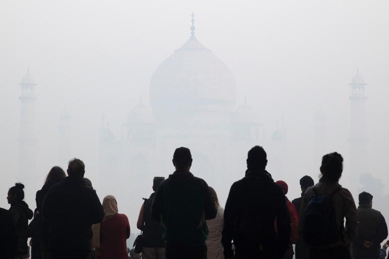 Visitors look toward the Taj Mahal through morning air pollution in Agra, India, January 12, 2019. (REUTERS/Andrew Kelly)