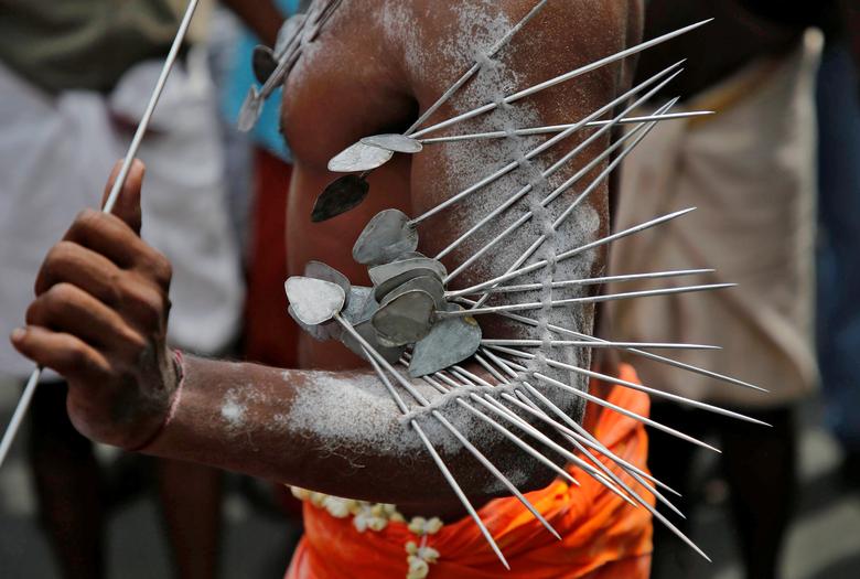 A Hindu devotee with his body pierced with metal skewers takes part in a procession during the Thaipusam festival on the outskirts of Kochi, India, January 21, 2019. (REUTERS/Sivaram V)