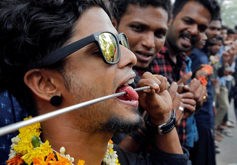 A Hindu devotee with his tongue pierced with a metal skewer takes part in a procession during the Thaipusam festival on the outskirts of Kochi, India, January 21, 2019. (REUTERS/Sivaram V)