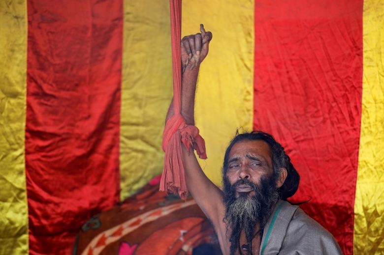 A Sadhu, or Hindu holy man, who has not moved his arm and cut his fingernails for 10 years, sits inside his camp during "Kumbh Mela", or the Pitcher Festival, in Prayagraj, previously known as Allahabad, India, January 17, 2019. (REUTERS/Danish Siddiqui)