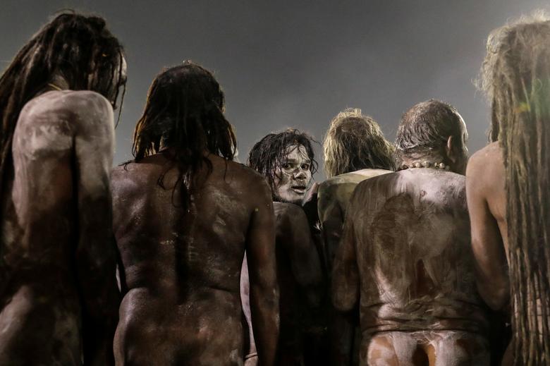 Naga Sadhus or Hindu holy men leave after taking a dip during the first "Shahi Snan" (grand bath) during "Kumbh Mela" or the Pitcher Festival, in Prayagraj, previously known as Allahabad, India, January 15, 2019. (REUTERS/Danish Siddiqui)