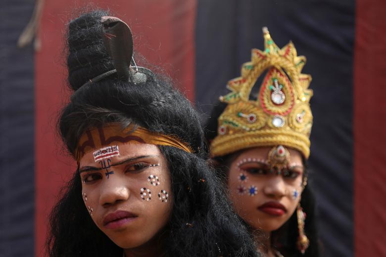 Children, dressed up as a Hindu God and Goddess, look on as they beg for alms during "Kumbh Mela", or the Pitcher Festival, in Prayagraj, previously known as Allahabad, India, January 14, 2019. (REUTERS/Anushree Fadnavis)